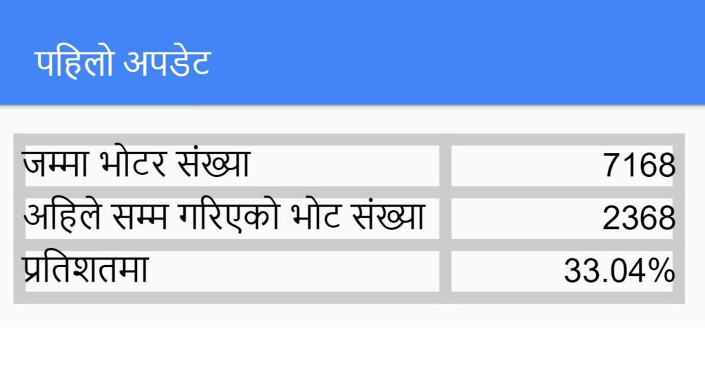 निर्वाचन कमिटीले दिएको जानकारीअनुसार दिउँसो १२ बजेसम्म २ हजार ३६८ जनाले मतदान गरेका छन् । याे ३३.०४ प्रतिशत हाे । मतदान आइतबार साँझ ७ बजेसम्म गर्न सकिनेछ ।