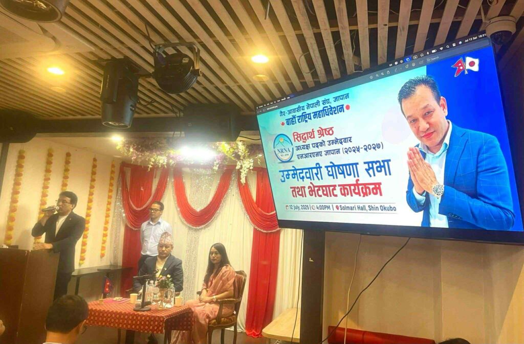 टोकियो। एनआरएनए (NRNA) जापानको आगामी कार्यकालको अध्यक्ष पदका लागि सुभाष लामिछाने र सिदार्थ श्रेष्ठले उम्मेदवारी दिने औपचारिक घोषणा गरेका छन् ।