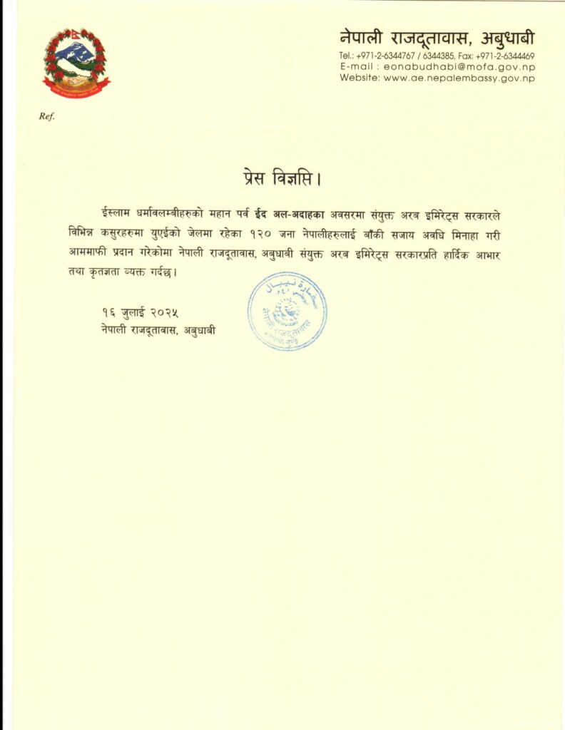 ‘ईस्लाम धर्मालम्बीहरूको महान पर्व ईद अल–अदाहका अवसरमा संयुक्त अरब इमिरेट्स सरकारले विभिन्न कसुरहरूमा यूएईको जेलमा रहेका १२० नेपालीहरूलाई बाँकी सजाय मिनाहा गरी आममाफी गरेकोमा नेपाली राजदूतावास, आवुधावी संयुक्त अरब इमिरेट्स सरकारप्रति हार्दिक आभार तथा कृतज्ञता व्यक्त गर्दछ’, राजदूतावासद्वारा जारी विज्ञप्तिमा भनिएको छ ।